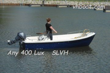 Any 400 Lux je laminátový dvouplášťový, elegantní člun pro rekreaci a vyhlídkové plavby. Jeho využití najdou i rybáři, kterým poskytuje dostatek prostoru v kokpitu. 400x150x60 cm, 120 Kg, 4 osoby, pro motor do15Hp krátká noha, kategorie plavby C, mořská příbřežní plavba. Člun má dvě schránky pro uložení věcí a ve špici je schránka na lano a kotvu.