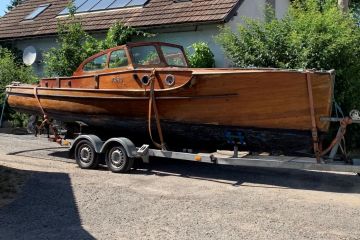 Rozměry - délka 7,2 m, šíře 1,7m, hmotnost cca 1500kg. Motor Albin 20 koní na benzin, funkční. Původní mahagon HONDURAS s krásnou kresbou. Na lodi je samozřejmě spousta práce, ale krásné práce. Absolutní klasika.