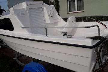 MOŽNOST POSKYTNUTÍ ZIMNÍ SLEVY. Nabízím kabinový ( kajutový )laminátový člun - loď, určený k turistice a rybaření. Člun je již vybaven nerezovým zábradlím na přídí a bocích, zadní a přední kotevní kladka, 4x vazák, kapitánské křeslo, výškově stavitelné + volant s přípravou kabelu a bovdenu na dálkové řízení motoru, 2x úložné boxy se zámky na palubě. poziční světlo, zasouvací roletové dveře se zámkem. Kabina je polstrovaná ( spání pro 2 osoby ), uvnitř příprava elektroinstalace na osvětlení, matrace, nerezový skládací řebřík pro vstup do lodi. Loď je v kategorii C ( pobřežní plavba na moři ). Specifikace: délka 430 cm, šířka 170 cm, pro 4 osoby, motor do 30 HP L dlouhá noha, nebo při objednání krátká noha ( 22,1 kw )váha 276 kg, k lodi je certifikát, záruka 2 roky. V ceně je podvalník , trailer ( nápravy Knott i naviják ) na loď do 5 m. Vše je nové ještě neregistrované určené k přihlášení. Pozn. Pokud bude loď vybavena motorem 5 HP není potřeba žádné registrace ani oprávnění k řízení.
