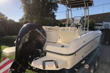 délka: 6.81 m, šířka: 2.36 m, ponor: 0.40 m, váha: 1226 kg, max.počet osob: 10, palivová nádrž: 167 lmax.výkon motoru: 150 ps, délka nohy: L, CE kategorie C, dokupované hliníkové bimini + krycí plachta proti vodě 1200eur. Echolot LOWRANCE HDS10, dodělaná sprcha paluba.Solární panel na dobíjení.