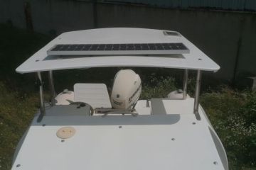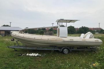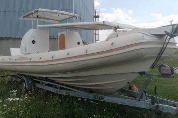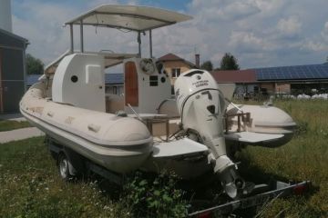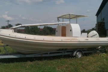 Super stav, na trajleru po generálce kol. 10 let kotvený na suchu na Pagu, teď 2 roky v ČR. Člun je připraven na campingovou úpravu přední části pro přenocování.