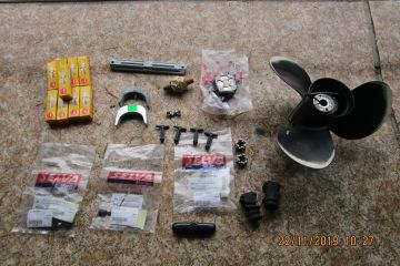 K motoru jsou tyto náhradní díly: proppeler, nové palivové čerpadlo, 9ks zapalovacích svíček,