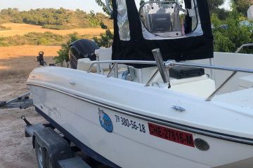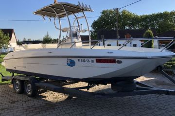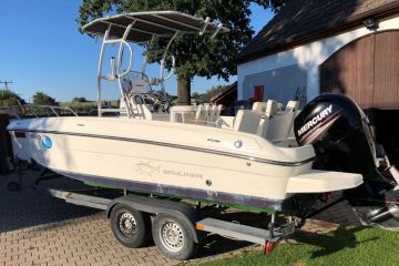 délka: 6.81 m, šířka: 2.36 m, ponor: 0.40 m, váha: 1226 kg, max.počet osob: 10, palivová nádrž: 167 lmax.výkon motoru: 150 ps, délka nohy: L, CE kategorie C, dokupované hliníkové bimini + krycí plachta proti vodě 1200eur. Echolot LOWRANCE HDS10, dodělaná sprcha paluba.Solární panel na dobíjení.