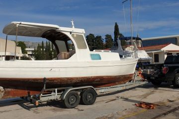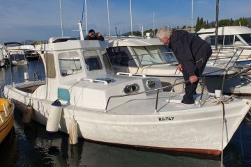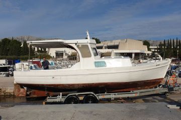 Rok výroby 1963, Motor diesel dvouválec do V zn.Faryman,výkon 13KW, délka 7,40m,2,50m, váha 2,5t ,pro 8 osob,dřevěná konstrukce,hard top,nutná oprava kýlu,motor funkční a spolehlivý,dovoz v.r.2019,Chorvatsko-Split,Chorvatské dokumenty, Velká kajuta a paluba. Cena 195 000,-Kč