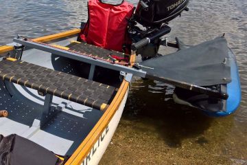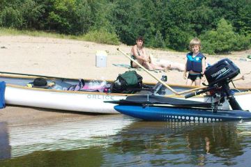 Prodám originální rychlou motorovou kánoi Orlici včetně vozíku. KÁNOE: vybavena stabilizačním výsuvným plovákem,jízda možná i bez plováku (je rychlejší), laminátová, zánovní, vyztužený kýl, 4 sedačky, pohodlné ovládání motoru ze zadní sedačky, nepotopitelná, 2 pádla, velmi rychlá, motor se při přepravě a parkování nemusí sundávat. MOTOR: Tohatsu 5HP - málo jetý, čtyřtakt, integrovaná nádrž v tělese motoru + přídavná benzínová nádrž, držák motoru univerzální – i pro menší motor. VOZÍK: bez SPZ, při sjezdu z kopce řiditelný řídítky, řidič sedí celkem pohodlně bokem na předku kánoe, mechanická pedálová brzda, tažné zařízení za auto nebo čtyřkolku. S vozíkem a kánoí se zajede přímo do vody. Předváděcí jízda po dohodě možná. Prodej i bez motoru a plováku.