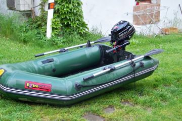 Člun d: 230 cm; š: 120/60m; 38 Kg. Prakticky nepoužívaný. Motor čtyřtakt japonský výrobce 10 provozních hodin. Prakticky nový. Viz. foto
