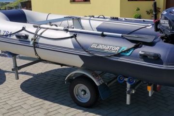 Nafukovací člun Gladiator 420 se skládací alu podlahou, 2 lavičkami, vazáky, lany, fendry, sluneční střechou, přepravními vaky, vysokotlakou pumpou s japonským čtyřtaktním přímovstřikovým motorem Tohatsu 20 hp a nebrzděným podvozkem s navijákem, lyžinami, odnímacím světelným panelem a podpěrným kolečkem (výrobek CBS). Komplet byl dán do provozu v r. 2018, napluto pouze na sladké vodě 20 mth. Cena k jednání je 98.000,-Kč + 21% DPH