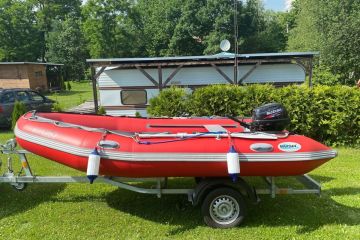 Prodám nafukovací člun Bush F40 s 20Hp motorem Suzuki. Člun prodáváme komplet jak je na fotkách (člun + motor + vozík). Vše kupované nové (první majitel), vždy od září do května garážované, pravidelně každoročně servisované, používané pouze na Slapech. Součástí člunu - pádla, nafukovací pumpa, 2x posuvná lavička, nádrž na benzin, kotva, světlo, zámek proti krádeži na motor a vozík. Top stav.