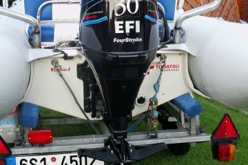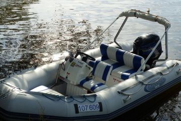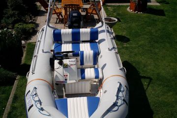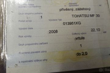 Člun rib délka 4 metry, bombard, originál france + přívěs. Vše bylo zakoupeno nové v čr jsem 1. majitel, tudíž žádný olítaný verk dotažený narychlo někde od moře. Provozováno pouze víkendově na Slapech, moře ne!!. Trvale garážované a pečlivě udržované,nikde nelepeno! Max v provozu 150 motohodin. Motor Tohatsu Japan 3 válec nejvyšší možná výbava 30 EPTS, e.trim, e.start, průměrná spotřeba cca 3,5l/hod. Max rychlost 2 osoby 45km. Nerezová přídová nádrž 30l, střední nádrž 12,5l. Přidám 2 vrtule, rychou a tažnou na lyžovani. Původní cena včetně vozejku 418tis. Ideální pro 2 děti 2 dospělé.Důvod prodeje,děti vyrostly, a mají jiné zájmy. Hlučná ložiska na vozejku. Cena dohodou.