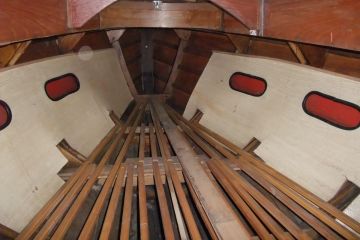 Dřevěný stěžeň a ráhno. Trup dřevo + laminát. Nutno opravit.