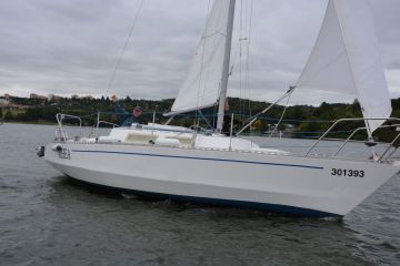 Prodám pevnou kajutovou plachetnici, výtlak 1,6t, d-7,6m š-2,6m, Gabon, vše olaminované, pevný nerez kýl, lze odejmout. Stěžeň dural, vanty, kování a kotva nerez. Nový tyčový rolfok a plná takeláž. Závěsný motor TOHATSU M8B. Kosatky, hlavní plachty, genakr a spinakr. Vybavená kajuta,velké uložné prostory, vařič, dřez, oddělená a vybavená ložnice, suché WC, nerez zásobník pitné vody s pumpou, přístroje,rozvod el., vnitřní a venkovní osvětlení, rádio. Velký, pohodlný kokpit. Na zádi samostatné baden plato, teak, a nerez žebřík. Rychlá a výborně manévrující, vhodná i na moře. Včetně manipulačního podvozku, lze převoz na podvalníku za silnějším OA.