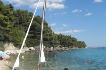 Prodám rekreační skládací katamaran s oplachtěním 12 m2, plováky - tenká překližková obšívka krytá sklolaminátem, s velkými úložnými prostory; pevná podlaha; kování a lanoví - nerez; palubníky, stěžeň - hliník-dural. Délka 435 cm, šířka 266 cm (transportní šířka max 148 cm). Možnost zavěšení motoru. Svinovací kosatka (rolfok), ruční navinování hlavní plachty na ráhno.