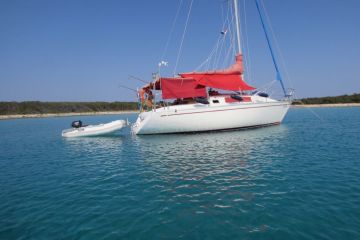 Plachetnice délky 7,65m,šířky 2,78m,ponor 1,15m,Nové oplachtění(kosatka 2016,hlavní 2018)nové biminy,kočárek,lazy back,nosič na pomocný člun na zádi z nerezi,fekální nádr s macerátorem,nová servisní baterie 80Ah(2019),rolky na vyvazovací lana na zádi -každé 50m lana.Měnič napětí 12/230V 350W,nabíjecí satnice při připojení v maríně s rozvodem 230V,lednice 12/230V a plyn,síťky proti hmyzu.Navigace Navman s mapami HR ,autopilot atd .Velmi pěkná udržovaná.Možnost stání v HR za 300 Eu/rok 2 km od jeřábu a maríny.Vozík k lodi možno dokoupit za 80 000,-.Pomocný nafukovací člun k lodi..Více foto a info na antesroman@email